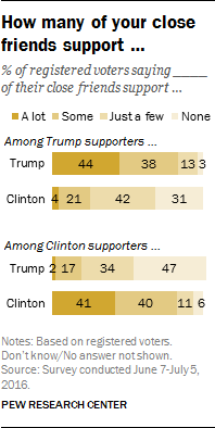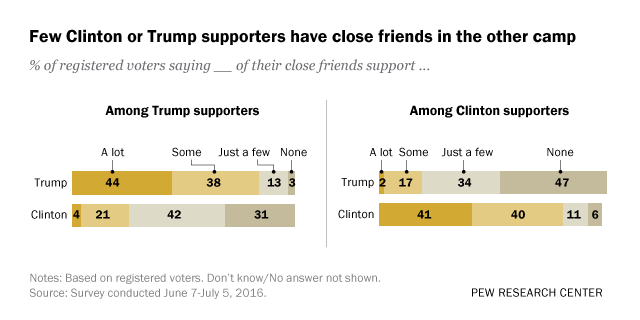 In an increasingly contentious presidential campaign, just a quarter of voters who support Donald Trump in the general election say they have a lot or some close friends who are supporters of Hillary Clinton. Even fewer Clinton backers (18%) say they have at least some friends who support Trump.