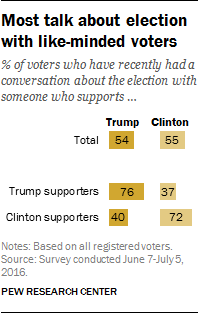 Clinton and Trump backers also are far more likely to talk about the election with those who favor “their” candidate than with those who back the opponent. In the survey, conducted before the party conventions, most voters (67%) say the election comes up in conversation at least somewhat often, but only 23% say it comes up very often.
