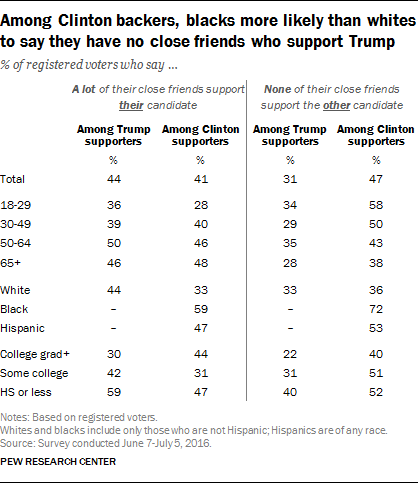 Among Clinton supporters, there are wide racial disparities: Fully 72% of Clinton’s black supporters say they have no close friends who support Trump. Just 36% of whites who back Clinton say the same, similar to the share of whites supporting Trump who do not have close friends who back Clinton (33%).