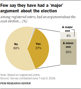 Some have had political arguments, but few ‘major’ ones. Nearly four-in-ten voters (37%) – including nearly identical shares of Clinton and Trump supporters – say they have had an argument about the election. But just 8% have had a “major” argument, while 30% have had a “minor” argument.