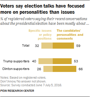 Though both Trump and Clinton supporters are more likely to say their conversations have been focused on personalities and comments rather than issues and policies, Clinton supporters are particularly likely to say this (66% vs. 53% of Trump supporters).