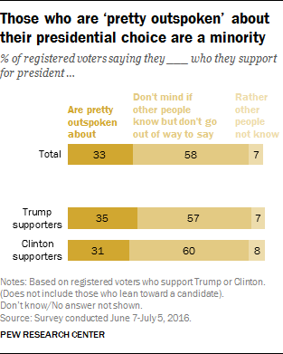 A majority of voters (58%) who currently plan to support either Trump or Clinton say they don’t mind if people know who they support but that they don’t go out of their way to say it. A third say that they are “pretty outspoken” with others about their support, while far fewer (7%) say that they would rather other people not know that they support one of these candidates.