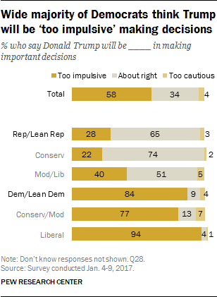 By contrast, Democrats overwhelmingly say that Trump will be too impulsive in making important decisions: 84% say this, compared with just 9% who think his approach will be about right. A wide majority of liberal Democrats (94%) say Trump will be too impulsive; a somewhat smaller majority of conservative and moderate Democrats say the same (77%).