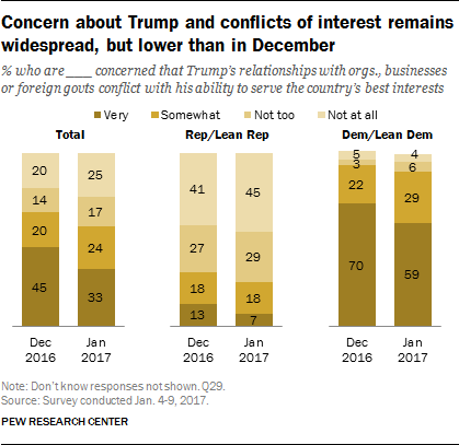 With Trump likely to face questions on how he plans to separate himself from his business interests as president, 57% of the public says they are either very (33%) or somewhat (24%) concerned that his relationships with organizations, businesses or foreign governments conflict with his ability to serve the country’s best interests. However, public concern is lower than it was in the immediate aftermath of the election: In December, 65% said they were at least somewhat concerned about Trump’s ability to serve the country’s best interests. The share saying they are very concerned about Trump’s potential conflicts of interest is down 12 points, from 45% a month ago.