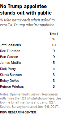 Today, 10% volunteer the name of Jeff Sessions, Trump’s choice for attorney general, when asked to name an administration appointee. About as many can recall the name of Trump’s nominee for Secretary of State (Rex Tillerson, 9%) or his nominee for Secretary of Housing and Urban Development (Ben Carson, 9%). Fewer can recall the names of other Trump appointees. For example, just 3% volunteer the name Steve Bannon, the former Breitbart News executive whom Trump named as his senior counselor and chief strategist.