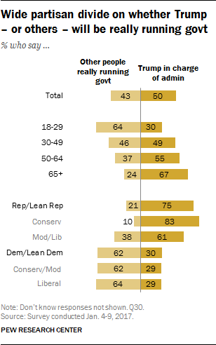 Young adults under age 30 do not think Trump will be in charge most of the time: 64% say other people will really be running the government. By contrast, 67% of those ages 65 and older say that Trump will be in charge of what goes on in his administration most of the time.