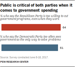 As Congress continues to debate the budget and government spending, majorities are critical of the way that both parties handle these issues. Nearly two-thirds (64%) say the Republican Party is “too willing to cut government programs even when they work.” About as many (61%) say the Democratic Party “too often sees government as the only way to solve problems.”