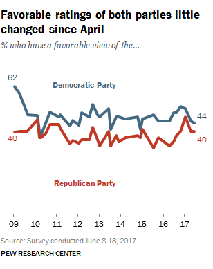 Perceptions of both parties remain little changed from April. Currently, four-in-ten have a favorable view of the Republican Party, while 54% express an unfavorable one. A comparable share of the public rates the Democratic Party favorably (44%), while half have an unfavorable opinion.