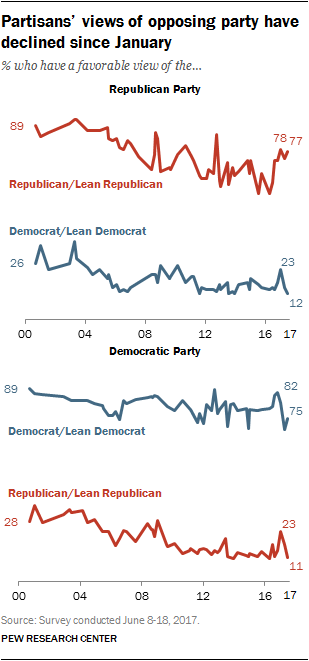 Fully three-quarters of Democrats (75%) rate their party positively today, up slightly from April (70%). Republicans view the Democratic Party less favorably today (11%) than they did in January (23%).