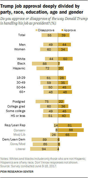 The latest national survey by Pew Research Center, conducted June 8-18 among 2,504 adults, finds that despite the tumult in Washington, overall impressions of the two parties – and President Trump – have changed very little since April. Currently, 39% approve of the way Trump is handling his job as president, while 55% disapprove. For more, see detailed demographic tables on Trump’s job approval.