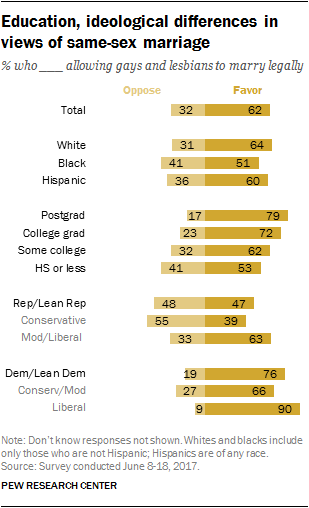 In the new survey, majorities across all educational groups now say they favor same-sex marriage, but levels of support are highest among those who have graduated from college: 79% among those with postgraduate degrees and 72% among those with bachelor’s degrees. Smaller majorities of those with some college experience but no college degree (62%) or those with no more than a high school degree (53%) say they favor allowing gays and lesbians to marry.