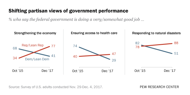Two years ago, with Barack Obama in the White House, more Democrats than Republicans expressed positive views of government performance in most specific areas. However, there were some issues – including responding to natural disasters and protecting the environment – on which members of both parties had similar evaluations.