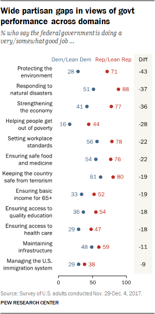 Republicans are more than twice as likely as Democrats to say the government does well in protecting the environment (71% vs. 28%). There also are sizable partisan gaps in views of the government’s performance in strengthening the economy and alleviating poverty.
