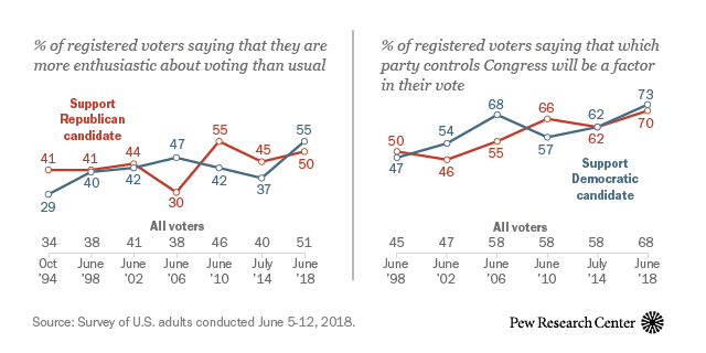 The new survey by Pew Research Center, conducted June 5-12 among 2,002 adults, including 1,608 registered voters, finds that, unlike in recent midterms, voter engagement is high among members of both parties. Overall, 51% of registered voters say they are more enthusiastic about voting than usual, the largest share expressing increased enthusiasm about voting in a congressional election in at least 20 years.